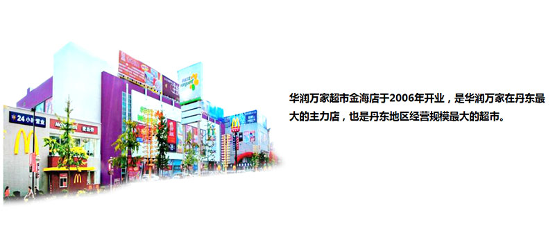金海商業(yè)廣場2004年11月開工,2006年竣工,位于丹東市東部,抵觸丹東東西主干道錦山大街和南北主干道金海路交匯處,是丹東東部地區(qū)的商業(yè)中心。總建筑面積約10萬平方米,由大型購物廣場、女人街A、B座室內(nèi)步行街、女人街C座、麥當勞、金海寶山批發(fā)城等主要建筑構(gòu)成 。大型購物中心樓前設(shè)有露天停車場,并配有先進的車輛停泊管理系統(tǒng),可以滿足整個商圈的停車需求。金海商業(yè)廣場擁有大型超市、五星影城、時尚餐飲、流行百貨、電器賣場、游樂中心、家具工廠店、小商品批發(fā)城等等,通過多種業(yè)態(tài)的錯位經(jīng)營,展現(xiàn)完善的購物、餐飲、娛樂、休閑、文化、旅游功能。