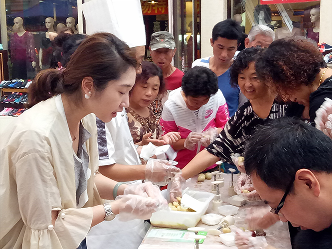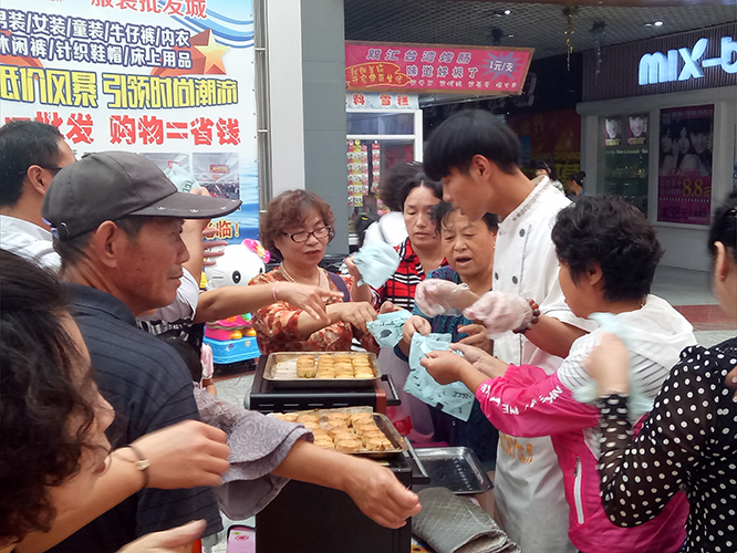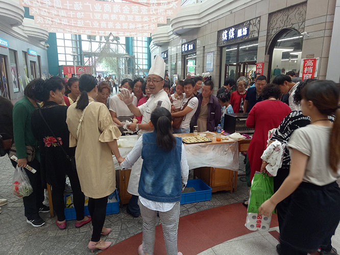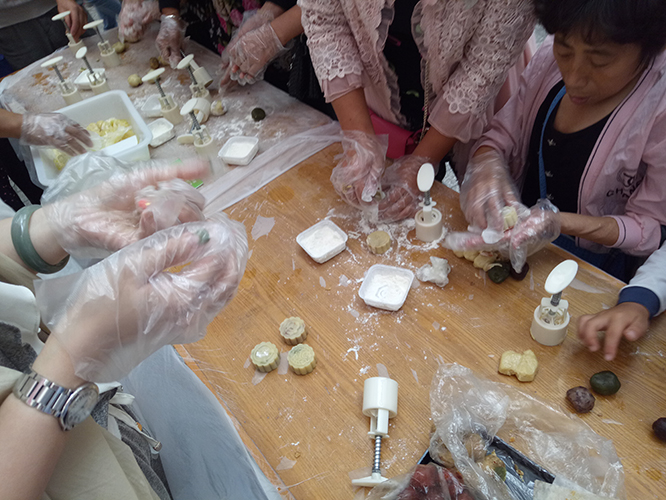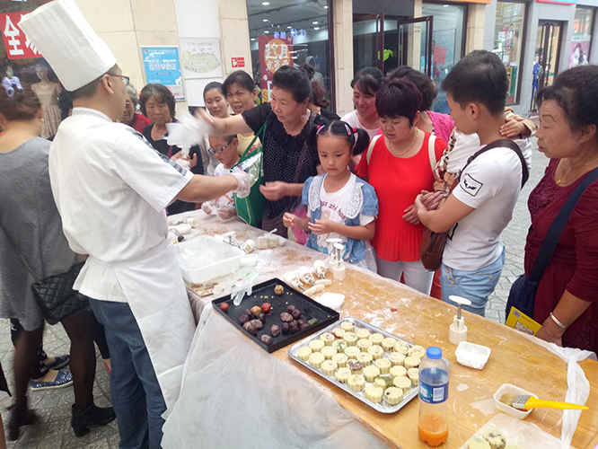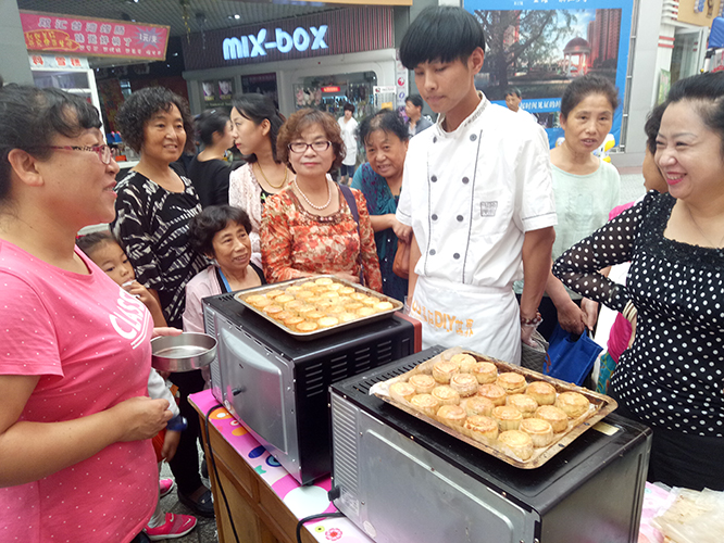 顧客在巧手師傅的指導下進行揉面、搟制水油皮、包餡料的月餅制作過程。大家邊拉家常邊親手制作,氣氛和樂融融。讓顧客在金海商業廣場感受到故鄉的溫情與團圓。制作好的月餅經過烤箱烤制后大家一起品嘗,歡聲笑語不絕于耳。