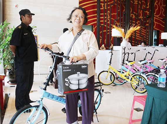 交完物業費的業主們在抽獎箱里抽取獎券,中獎率達到100%,喜得大獎的業主興高采烈。本次獎品有折疊自行車、大米、保溫杯、蒸鍋等,當天交費辦卡的業主都滿載而歸。一位中獎的業主說“到商場買東西經常抽大獎,沒想到咱交物業費還能抽大獎,住在金海真的很幸福!”。