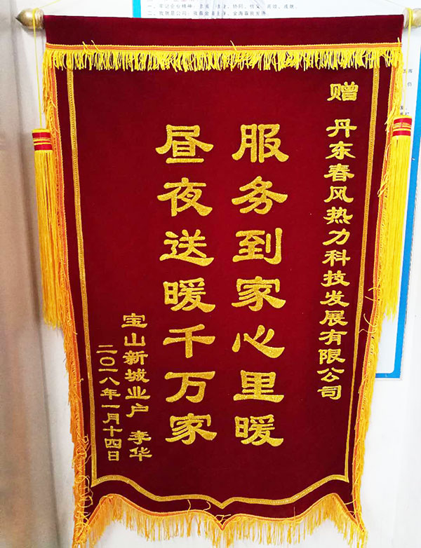 金海熱力公司員工熱情真誠、高效快捷的優(yōu)秀服務(wù),讓客戶非常感動,特制作一面錦旗親自送到熱力公司,對我公司維修人員的耐心熱情的服務(wù)表示感謝。
