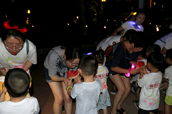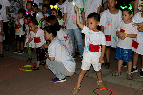 夜跑開始前進行了西瓜大作戰、瘋狂指壓板、夜光飛圈游戲活動,家長萌娃們一齊上陣,參與其中,歡聲笑語不斷地從濱江3號園區中傳來。