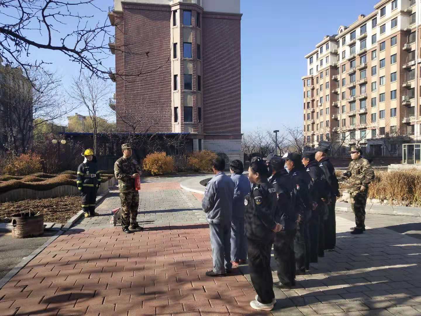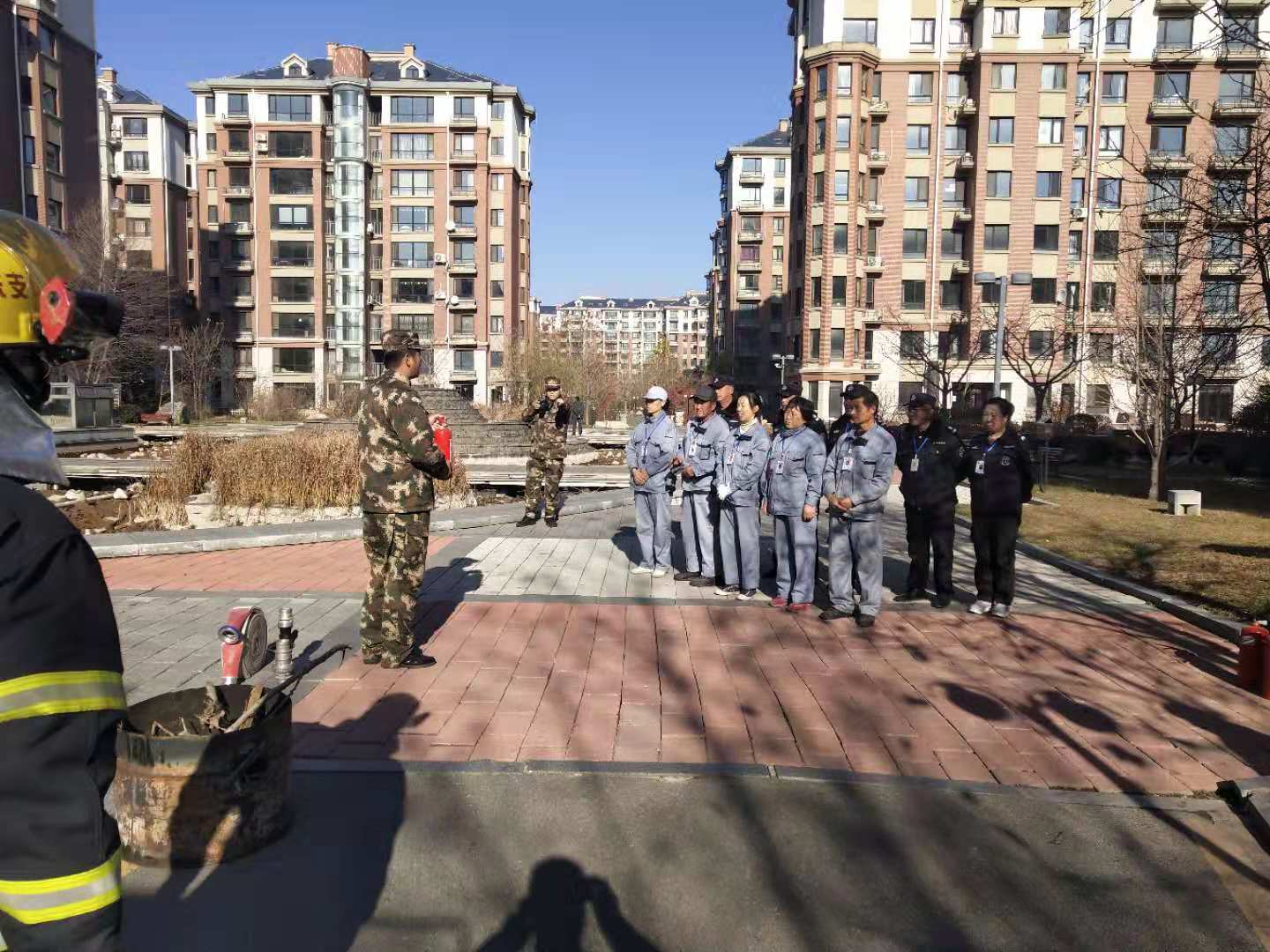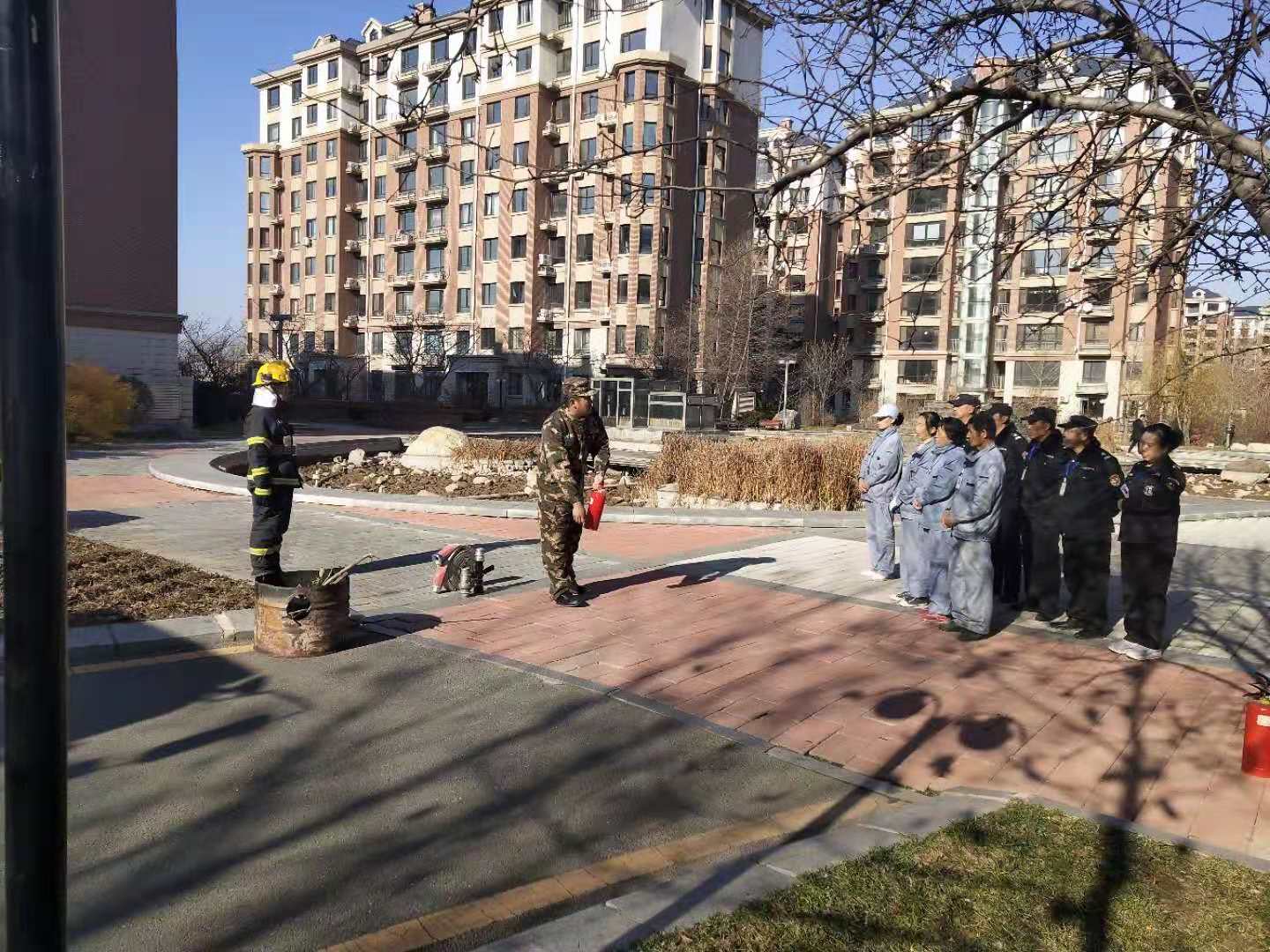 繼11月12日江畔花園消防知識培訓(xùn)后,14日上午物業(yè)公司又組織溫泉小鎮(zhèn)管理部進行消防培訓(xùn)。特聘請振安區(qū)五龍背消防中隊,在園區(qū)中央噴泉空地,開展消防培訓(xùn)及消防演練。