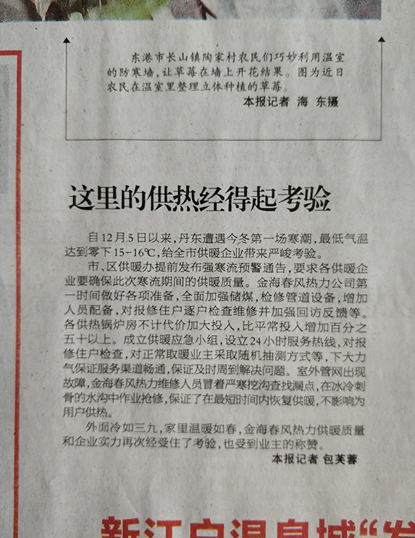 外面冷如三九,家里溫暖如春,保證金海供熱轄區用戶平穩度過寒潮影響期,金海春風熱力供暖質量和企業實力再次經受住了考驗,也受到業主的稱贊。