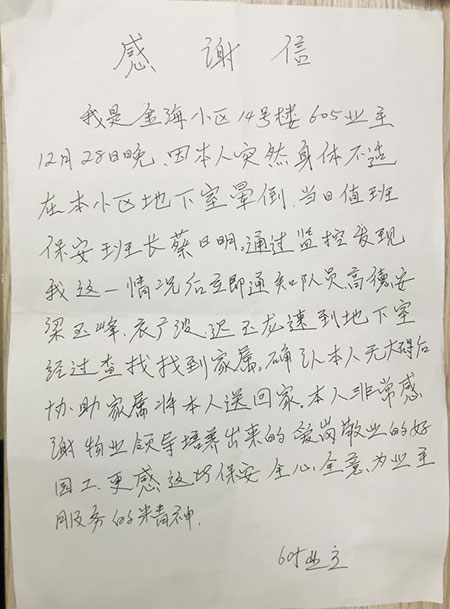 事情雖小,但幾位保安的細心服務和體貼到位,讓業主深受感動,親筆給溫泉小鎮物業管理部寫了一封表揚信,感激他對金海物業的感激之情。他在信中說,非常感謝金海物業的領導能培養出這么多愛崗敬業的好員工,更感謝物業的保安們全心全意為業主服務的精神!