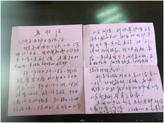 劉俊等同志對業主關系像親人一樣,讓我感到溫暖和感動,我為小區能有這樣的物業工作人員而感到幸運和自豪,真誠地建議公司表彰獎勵劉俊、王春紅等工作人員。