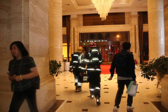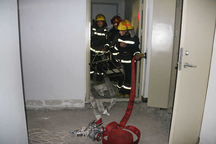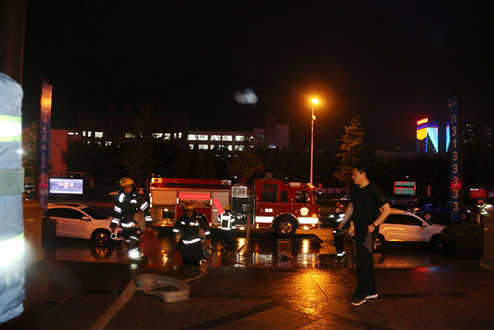 晚上8點演練在大廈門口正式開始,現場總指揮由消防救援支隊參謀長趙凱特、指揮長王永旭全程指揮,演練共分為:室內救援、高層布設水袋、高空救援等課目。