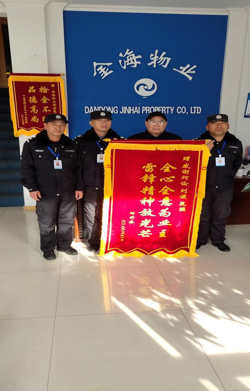 第二天,郭進(jìn)班長(zhǎng)吩咐各崗執(zhí)勤保安,如果看到業(yè)主,一定要提醒他去取回錢包。在大家的努力下,業(yè)主在第二天上午就取回了丟失的錢包。業(yè)主對(duì)金海保安員的感激之情溢于言表,給新世紀(jì)佳園管理部送來了錦旗,表達(dá)錢包失而復(fù)得的激動(dòng)心情和感激之意。