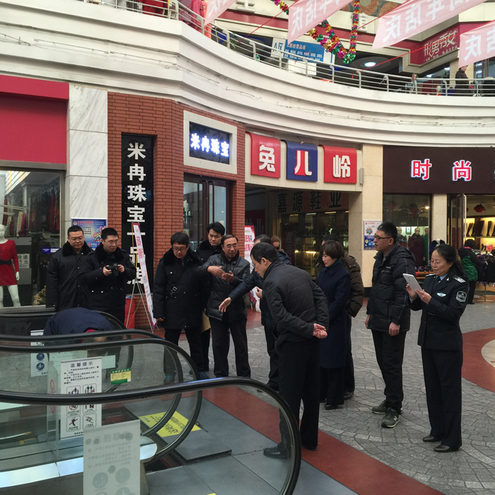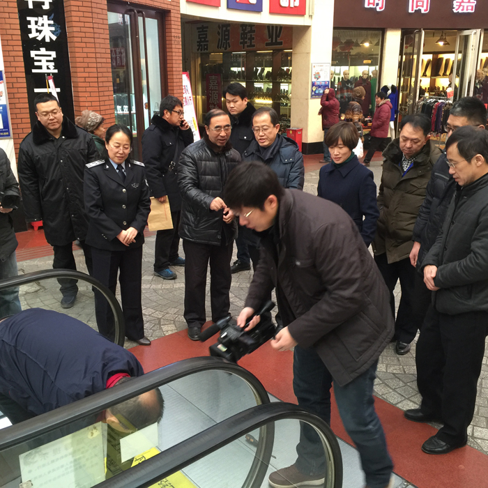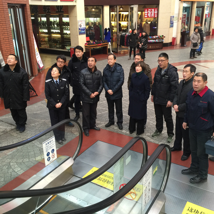 2016年2月2日上午9點丹東市質監局盧局長、元寶區質監局王局長、藤局長等8人在丹東電視臺記者的陪同下,對全市特種設備優秀管理單位進行工作指導。金海商業公司常總、于曉東、王樂彬、劉偉、電梯維保人員,陪同質監局領導進行工作指導,盧局長對金海商業公司長期注重企業生產安全,嚴格對設備管理、人員管理、制度管理工作給予高度評價。