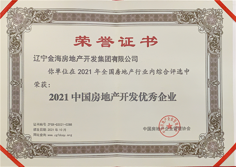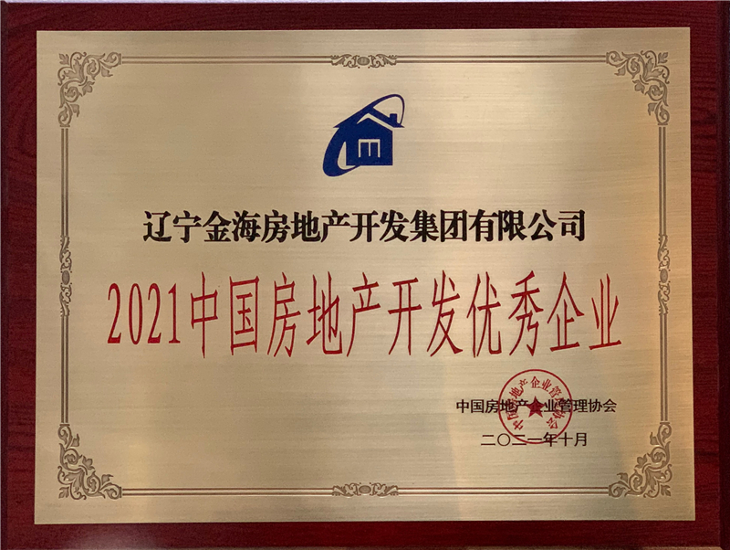 2021年10月,遼寧金海房地產開發集團有限公司在中國房地產企業管理協會組織開展的2021年全國房地產行業內綜合評選中榮獲“2021中國房地產開發優秀企業”稱號。